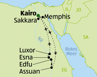 - Verpflegung: Halbpension mit Frühstücks- und Abendbuffet (Hotel) bzw. Vollpension mit Frühstücks-, Mittags- und Abendbuffet (Schiff von Assuan nach Luxor)