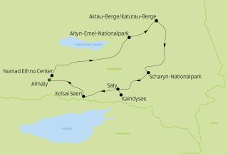 Tag 7 Kaindysee – Saty – Almaty • Fahrt zum Kaindysee. Wanderung zum Bergsee auf 1.700 Metern Höhe. Zeit zur freien Verfügung, um am See zu entspannen und die Aussicht auf das Kungej-Alatau-Gebirge zu genießen. Zu Mittag Fahrt zurück nach Saty und Mittagessen. Nachmittags Rückfahrt nach Almaty. Abendessen in einem lokalen Restaurant und Übernachtung in Almaty.