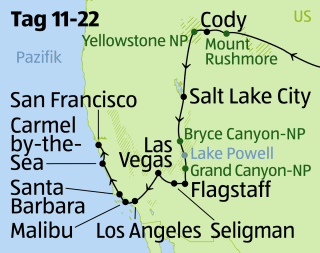 Tag 19 Los Angeles – Malibu – Santa Barbara • Am Morgen Fahrt nach Santa Barbara, wo palmengesäumte Gehwege den weißen Sandstrand abgrenzen. Santa Barbara ist ein beliebter Urlaubsort und wird aus diesem Grund auch oftmals als die Côte d'Azur des Westens bezeichnet. Die Stadt ist bekannt für ihren spanischen Einfluss. Auf dem Weg dorthin machen Sie Halt am berühmten Rettungsschwimmerhäuschen in Malibu, welches die Serie „Baywatch“ berühmt machte.