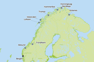 Tag 8 Kirkenes • Das „Tor nach Osten“ ist Wendepunkt Ihrer Reise und die letzte norwegische Stadt vor der russischen Grenze. Jetzt befinden Sie sich so weit im Osten wie es auf dieser Seereise nur möglich ist. Die Grenze zu Russland ist nur wenige Kilometer entfernt und der Austausch zwischen den beiden Ländern reicht so weit, dass die Straßenschilder in Kirkenes sowohl auf Norwegisch als auch auf Russisch zu lesen sind. Im Rahmen einer unserer Ausflüge können Sie bis an die russische Grenze fahren. Oder wie wäre es mit einem Besuch im Eishotel, das vollständig aus Schnee und Eis gebaut wurde?