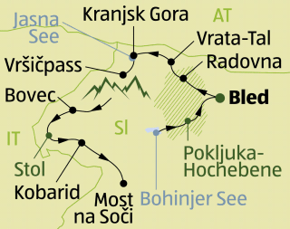 Tag 3 Bled – Radovna-Tal – Vrata-Tal – Kranjska Gora (Weg ca. 54 km, Aufstieg ca. 930 m, Abstieg ca. 620 m) • Nach dem Frühstück fahren Sie auf einer asphaltierten Straße in Richtung Kranjska Gora. Das Gebiet des Flusses Radovna ist besonders reizvoll. Sie radeln weiter durch das Tal Radovna, das sich im Triglav-Nationalpark befindet. Unterwegs passieren Sie mehrere Natur- und Kultursehenswürdigkeiten. In Mojstrana fahren Sie auf der Schotterstraße in das Vrata-Tal, eines der schönsten Alpentäler. Sie kommen zunächst am Slowenischen Alpenmuseum (Eintritt fakultativ, zahlbar vor Ort) und dann am Peričnik-Wasserfall vorbei. Sie radeln entlang des Flusses bis zum oberen Teil des Tals. Dort befindet sich eine schöne Berghütte mit einem netten Restaurant. Von hier aus haben Sie einen herrlichen Blick auf die Nordwand des Berges Triglav. Dann fahren Sie entlang des Flusses Triglavska Bistrica hinunter nach Mojstrana. Entlang der ehemaligen Bahnlinie, die heute ein Radweg ist, fahren Sie noch einige Kilometer bis zu Ihrem Hotel in Kranjska Gora, wo Ihr Gepäck bereits auf Sie wartet. Übernachtung in Kranjska Gora.