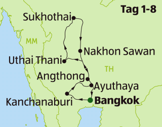 Tag 8 Sukhothai – Nakhon Sawan – Angthong – Bangkok • Auf dem Rückweg besuchen Sie die Stadt Nakhon Sawan, wo sich kleine Flüsse vereinen und den mächtigen Chao Phraya-Fluss bilden, der die Lebensader Thailands darstellt. Weiterfahrt nach Süden zu Ihrem letzten Halt am Wat Muang in Ang Thong, wo Sie den gigantischen sitzenden Buddha besichtigen können. Anschließend Fahrt nach Bangkok.